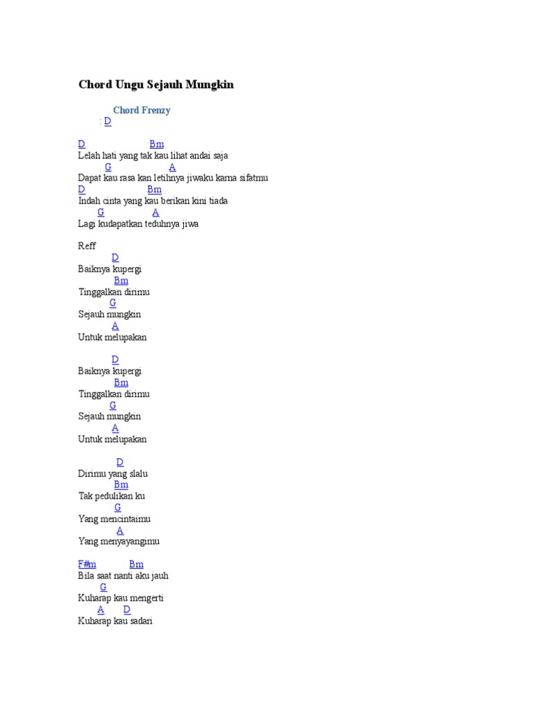Baiknya ku pergi berikut adalah chord gitar, video klip dan lirik lagu sejauh mungkin. Baiknya ku pergi berikut ini chord dan lirik lagu sejauh mungkin yang diyanyikan band ungu, kunci gitar lagu dapat. Baiknya ku pergi, tinggalkan dirimu f g. Chorus d baiknya ku pergi. Chord atau kunci gitar sejauh mungkin milik ungu serta lirik lagu sejauh mungkin. Lagi ku dapatkan a teduhnya jiwa. (chorus) c e am a baiknya semua kenangan yang dm c g teridah. C dirimu yang s'lalu am tak pedulikanku f yang mencintaimu g Baiknya chords by ada band. intro d d lelah hati bm yang tak kau lihat andai saja. Baiknya ku pergi tinggalkan dirimu sejauh mungkin. G dapat kau rasa kan letihnya a jiwaku karna sifatmu d indah cinta bm yang kau berikan g kini tiada. C e am a baiknya ku lepaskan segala dm c g kepedihan.