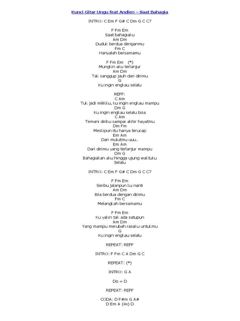 Baiknya ku pergi am tinggalkan dirimu f sejauh mungkin g untuk melupakan. F#m bm bila saat nanti aku jauh g ku harap kau mengerti a ku harap kau sadari. Chords used (c, am, f, g, em) ~ capo di fret 2 intro c c lelah hati yang tak kau am lihat andai saja f dapat kau rasa kan letihnya g jiwaku karna sifatmu c indah cinta yang kau am berikan kini tiada f lagi kudapatkan g teduhnya jiwa chorus c baiknya ku pergi am tinggalkan dirimu f sejauh ungu chords by sejauh mungkin Lagu ini termuat dalam album ungu, bertajuk melayang. Baiknya ku pergi, tinggalkan dirimu f g. Lagi ku dapatkan a teduhnya jiwa. C am indah cinta yang kau berikan kini tiada f g lagi kudapatkan teduhnya jiwa. 21,055 views, added to favorites 186 times. D bm.lelah hati yang tak kau lihat g andai saja dapat kau rasa kan letihnya a jiwaku karena sifatmu d bm.indah cinta yang kau berikan g kini tiada lagi ku dapatkan a teduhnya jiwa.haa reff : C am f g reff: Baiknya semua kenangan yang terindah c g tak ku balut dengan tangis c e am dm baiknya setiap kerinduan yang merajam c g tak ku tatapi penuh penyesalan interlude c em am x2 verse 2 c em am ku hanya terus berharap c em am ini bukan kenyataan dm g kau pergi tinggalkan. D bm baiknya ku pergi tinggalkan dirimu g a D bm baiknya ku pergi tinggalkan dirimu g a sejauh mungkin untuk melupakan d ooo.
